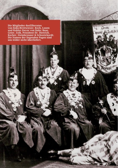 Die Mitglieder desElferrates von links:Breitwieser, Koch, Looen und Kohler.Davor von links: Baas, Geier, Zolk, Präsident Dr. Dietrich, Kocher, Steinbrenner & Schweickardt. Die Namen der liegenden Pagen sind uns leider nicht überliefert. 40