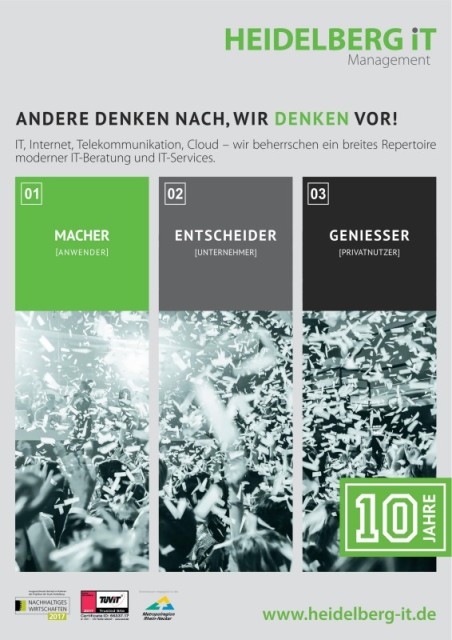 ANDERE DENKEN NACH, WIR DENKEN VOR! IT, Internet, Telekommunikation, Cloud – wir beherrschen ein breites Repertoire moderner IT-Beratung und IT-Services. MACHER ENTSCHEIDER GENIESSER [ANWENDER] [UNTERNEHMER] [PRIVATNUTZER] JAHRE www.heidelberg-it.de