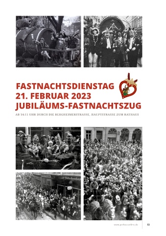 FASTNACHTSDIENSTAG 21. FEBRUAR 2023 JUBILÄUMS-FASTNACHTSZUG AB 14:11 UHR DURCH DIE BERGHEIMERSTRASSE, HAUPTSTRASSE ZUM RATHAUS www.perkeo-online.de 53