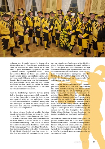 der Musikerinnen und Musiker. Der Perkeo-Fanfa- nicht nur bemerkenswert, es ist großartig!“ Er erin- Janeck, aktives Mitglied und Vertreter des Fanfa- Zeugnis musikalischer Kontinuität und Qualität.