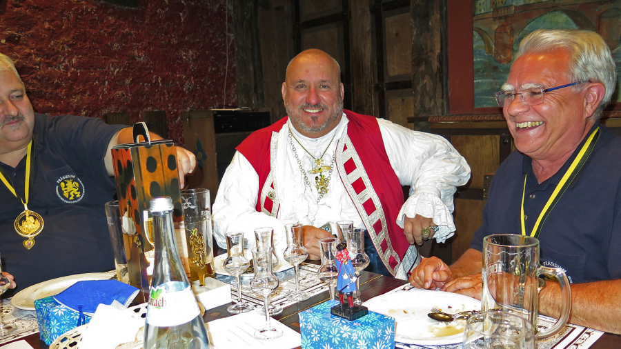 Nach dem Rundgang saßen die Präsidiumsmitglieder der Vereinigung und der Perkeo-Gesellschaft noch stundenlang zusammen und fachsimpelten im Güldenen Schaf über die Zukunft der Fastnacht. Der Präsident der Vereinigung, Jürgen Lesmeister, sein Vize-Präsident aus der Pfalz, Gerald Bleimeier, und die Bezirksvorsitzenden der einzelnen Regionen konnten nicht nur eine schöne Erinnerung an einem schönen Samstagabend mit nach Hause nehmen, sondern auch eine Figur des Hofnarren Perkeo. Das Wiedersehen in der Heidelberger Fastnacht ist garantiert, denn bereits bei der großen Prunksitzung der Perkeo-Gesellschaft am 20. Februar 2022 trifft man sich wieder.