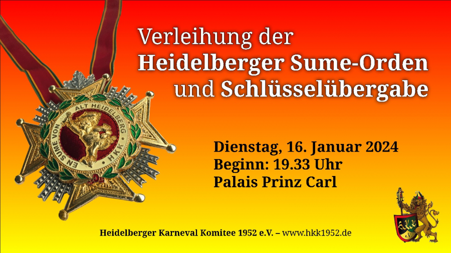 Auch alle bisherigen Träger dieser ehrwürdigen Auszeichnung sind herzlich zu diesem Festakt eingeladen. Im Rahmen dieser Veranstaltung wird auch Oberbürgermeister Prof. Dr. Würzner den Goldenen Stadtschlüssel an die Symbolfigur der Heidelberger Fastnacht übergeben. Dieser wird fortan, bis Aschermittwoch, weise und humorvoll über die Neckarmetropole regieren.
