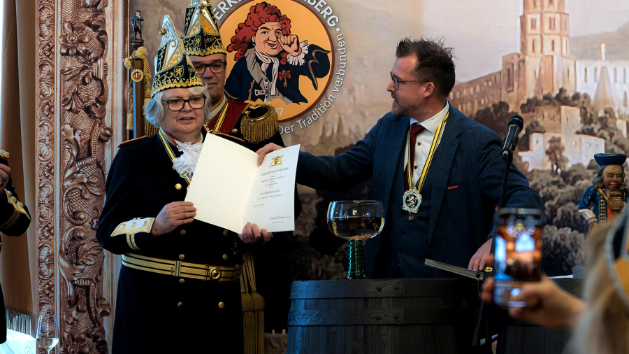 Schatzmeisterin Brigitte Horn wurde mit der Ehrennadel des Landes Baden-Württemberg geehrt. Der Ministerpräsident würdigte damit ihre 15-jährige engagierte Tätigkeit und Verdienste für die Perkeo-Gesellschaft.