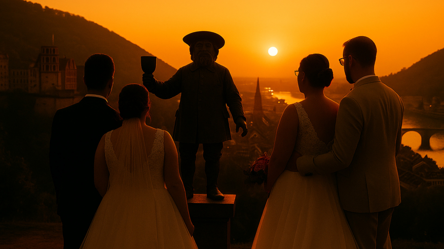 Sogar Perkeo selbst war mit seiner Ehreneskorte und zahlreichen Mitgliedern vor Ort und zeigte sich sichtlich bewegt: „Dass heute zwei Mitglieder unseres Fanfarenzugs heiraten, ist ein starkes Zeichen – noch vor wenigen Jahren wäre das undenkbar gewesen, da der Fanfarenzug lange nur aus Männern bestand.“