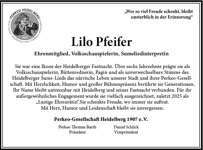 Lilo Pfeifer war mehr als ein Name – sie war Gefühl, Stimme und Gesicht der Heidelberger Fastnacht. Sie schenkte Generationen von Menschen Freude, Lachen, Gänsehaut und unvergessliche Momente. Mit ihrer Herzlichkeit, ihrer Verlässlichkeit und ihrer unverwechselbaren Ausstrahlung wird sie für immer Teil unserer Gemeinschaft bleiben.